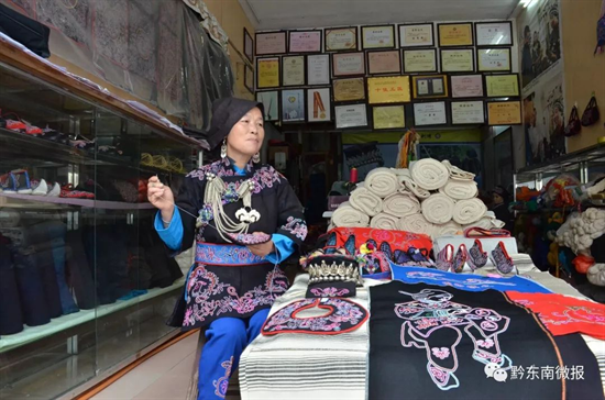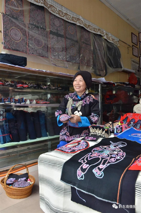2013年,陳顯月籌集資金20萬元,租借場地作廠房,創(chuàng)辦了錦屏縣北侗民族刺繡廠,將當(dāng)?shù)氐睦C娘聚集起來,生產(chǎn)開發(fā)系列刺繡工藝品。
