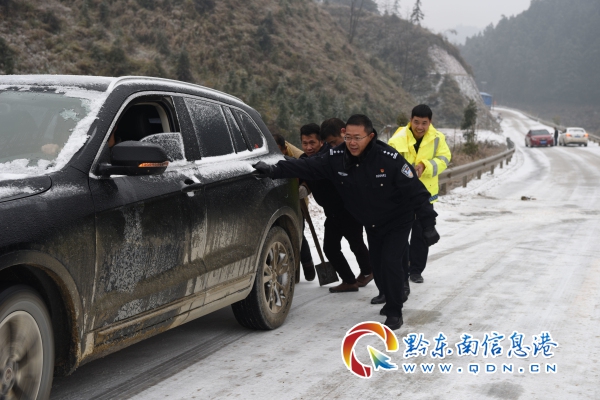 大雪中,錦屏縣公安局黨委書記、局長肖文斌等領(lǐng)導(dǎo)到大同鄉(xiāng)秀洞坡檢查道路交通安全,見由于坡陡路滑,不少車輛打滑難行,便組織民警們當(dāng)起了臨時"推車員",先后將10 多輛打滑送過坡頂,給漫天飛雪中的秀洞坡增添了一道特殊的"雪警"。
