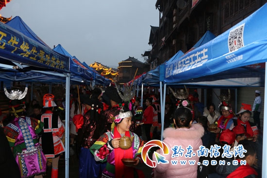 即使是連綿的雨天,也抵擋不住下司古鎮(zhèn)的熱情。在景區(qū)入口處,身穿不同民族服飾的姑娘們載歌載舞,舉杯獻(xiàn)飲藍(lán)莓酒,新年共享好福氣。并獻(xiàn)上節(jié)日紅蛋一枚,小小的紅蛋,暗藏玄機(jī)。每一顆蛋內(nèi),都藏著下司古鎮(zhèn)對(duì)游客深深的祝福。