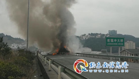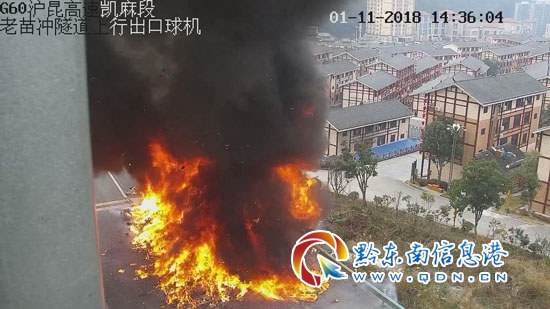本網訊 昨天(1月11日)一條關于“凱里一貨車高速公路上自燃,現場濃煙滾滾,陣勢駭人”的新聞傳遍凱里人的微信朋友圈。視頻中能看到一輛大貨車停在凱里民族風情園附近的高速公路橋上冒著滾滾濃煙,燃著熊熊火焰,期間還伴隨著一聲類似爆炸聲的巨響。