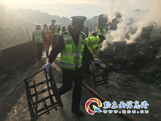 經(jīng)過一個多小時的緊張救援,火勢基本得到控制,但此時的大貨車已被燒得面目全非,現(xiàn)場一片狼藉。為了盡快恢復(fù)正常的交通秩序,一直在現(xiàn)場組織救援的王萬江大隊長帶領(lǐng)民警聯(lián)合“一路三方”的工作人員,對現(xiàn)場進(jìn)行初步清理,將被嚴(yán)重?zé)龤Ф袈湓诘缆飞系呢浳镆频綉?yīng)急車道,用鏟子將凝結(jié)在路面上的污物集中鏟到一旁,以最快的速度清理出超車道,以半幅通行的方式恢復(fù)交通,讓滯留在事發(fā)路段后方的車輛得以安全通過。