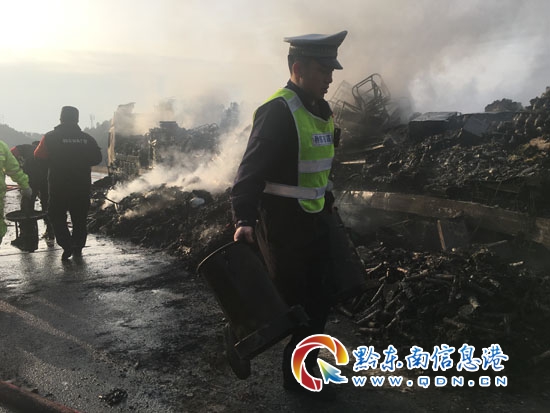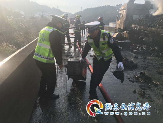 當(dāng)黔東南州交警支隊高速一大隊民警趕到現(xiàn)場時,看見貨車原本還冒著滾滾濃煙,火借風(fēng)勢,本來不大的著火點(diǎn)迅速蔓延開來,幾分鐘后貨車就全部被熊熊大火包圍。此時民警不敢輕舉妄動,也不敢輕易靠近起火貨車,而是迅速在據(jù)起火貨車后方一百米處做好安全防護(hù)措施,示意后方來車有序停靠,防止火勢過大,傷及過往車輛。并通知在凱里東站執(zhí)勤的民警進(jìn)行遠(yuǎn)端分流,防止車輛大規(guī)模滯留在高速公路上。幾分鐘過后,消防部門也趕到現(xiàn)場,對起火貨車展開救援。