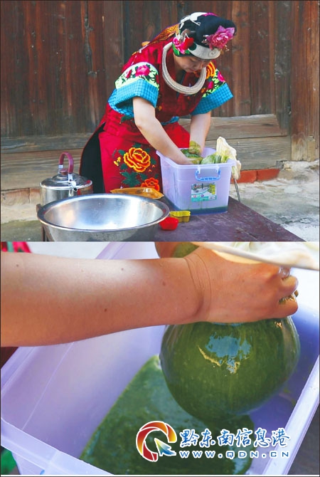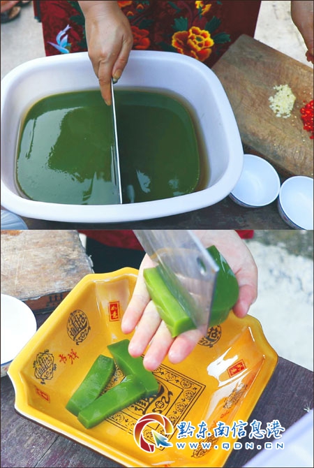 苗族斑鳩豆腐,制作工藝簡單,摘其嫩葉洗凈后置于筲箕用手揉搓成糊狀,再用干凈紗布過濾葉渣。然后取草木灰水適量加入葉汁中調和均勻,即邊用筷子攪動均勻,靜置后,葉汁漸變稠直至凝固的化合物。其呈墨綠色,晶瑩透亮,芳香清涼,是防暑降溫的佳品。