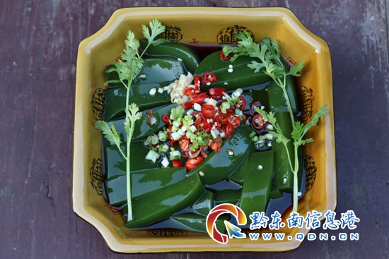 苗族斑鳩豆腐是一種叫“斑鳩樹”植物葉子為原料以草木灰水作佐料制作而成的膠狀凝固化合物,呈天然的綠色健康食品。因其形狀像翡翠,也叫“翡翠豆腐”其味道鮮嫩爽滑,是獨特的休閑食品和季節菜。