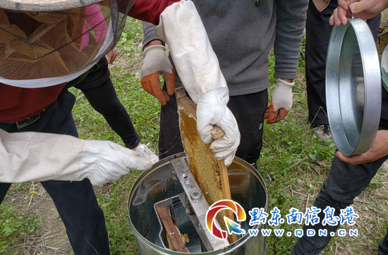 本網(wǎng)訊 “小心翼翼地揭開蜂箱后, 從成群結(jié)隊(duì)的小蜜蜂中取出滿是蜂蜜的蜜蓋子, 在蜂巢上劃過一刀,然后將蜜蓋子放在搖蜜容器中, 輕輕搖動(dòng)把手, 金黃色的黏稠蜂蜜就流入桶中……” 老鴉村副主任顧德梅在中蜂業(yè)技術(shù)員手把手的指導(dǎo)下,正忙碌著搖蜜。