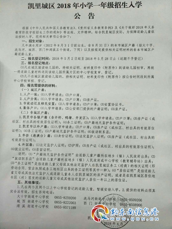 本網訊 (記者 王曉)近期,凱里市有關部門下發城區幼兒園“升學”進入一年級的報名公告,公告稱,市區在幼兒園上學在今年“畢業”的兒童進入一年級上學,須在2018年5月2日起至2018年5月28日期間到指定地點去報名,過期不予登記。
