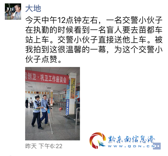 凱里市公安局交警大隊經了解得知,照片上的輔警是爐山中隊交警潘松平,5月16日中午,潘松平正在環城北路苗都客車站路段執勤,發現從出租車上下來一名顫顫巍巍的老人,立即上前攙扶并詢問情況。