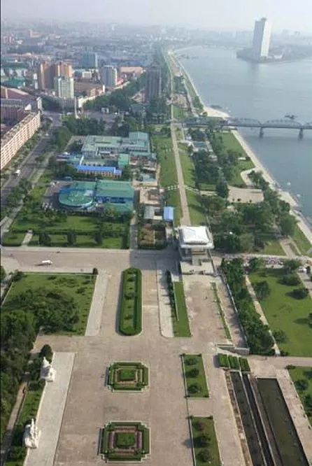 朝鮮最高的鋼架大樓柳京大廈,格外突出,外形似火箭,但據(jù)說建了30年還沒竣工,外墻是整齊的,內部裝修沒完成。