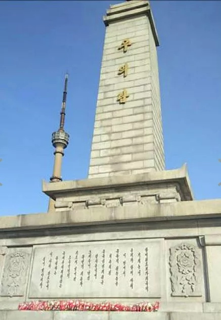 在平壤的下一個游覽景點是思想塔,他有170米高,我們花50元坐電梯到塔頂,看到平壤全景,非常壯觀,所有的游客都激動不已!