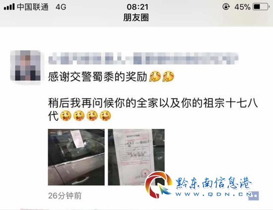 凱里市公安局交警大隊鎖定了發帖人翟某某,并在他上班的地方找到了他。據翟某交待,他的車被朋友借走,違停在電廠新村一路段,當看到罰單后,心里就窩了一肚子火沒處發,一時氣不過就在微信朋友圈發布了辱罵交警的信息。
