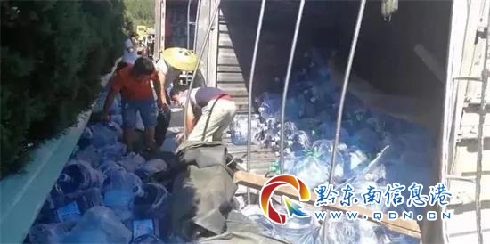 做好安全防護后,民警對現(xiàn)場進行勘察,并詢問駕駛員后得知。駕駛員當天拉了350桶桶裝礦泉水,從都勻出發(fā)準備前往凱里。當車輛行駛到事發(fā)路段時,貨車右后輪突然爆胎,導致車輛瞬間失控,車頭撞擊左側護欄后,車輛發(fā)生側翻。貨箱內的350桶礦泉水散落一地。