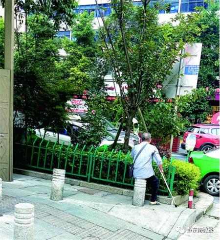 只見拎著大包小包的市民,依靠在路邊的護欄上休息。再往下一點路口處,一位拄著拐杖的老人正坐在用來阻擋車輛進入人行道的石礅上休息。離老人不遠處,兩位婦女也靠坐在護欄上歇腳。