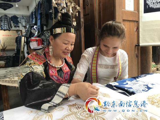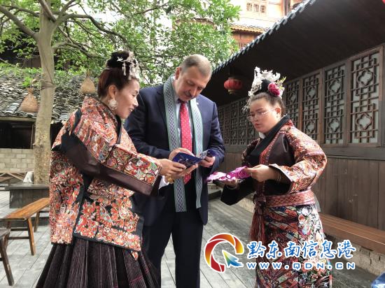上海合作組織成員國駐華外交官代表團在下司古鎮導游的帶領下,先是到達1808新民文創街的簽名墻進行簽名儀式。活動上,黔東南地區非物質文化遺產傳承人在現場演繹銅鼓民間畫創作、互動扎染制作、手工刺繡技藝等表演,讓代表團的腳步變得緩慢了起來。
