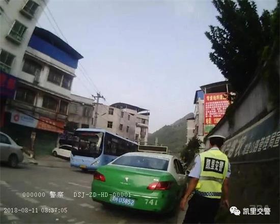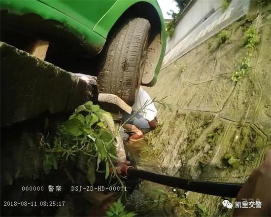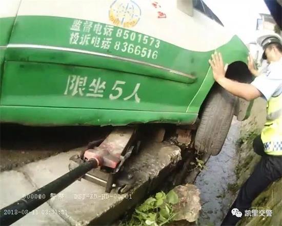 當(dāng)時(shí),凱里市公安局交警大隊(duì)城區(qū)三中隊(duì)巡邏交警巡邏至普舍寨時(shí),發(fā)現(xiàn)一輛出租車停在路邊打開了雙閃燈。交警上前查看時(shí)發(fā)現(xiàn),出租車右前輪被卡在路旁的深溝里“動(dòng)彈不得”,如果不是輪胎被卡,就有可能撞上墻體了。經(jīng)過詢問出租車駕駛員得知,他是為了避讓一輛摩托車才猛打方向盤,結(jié)果差點(diǎn)撞到墻引發(fā)交通事故。