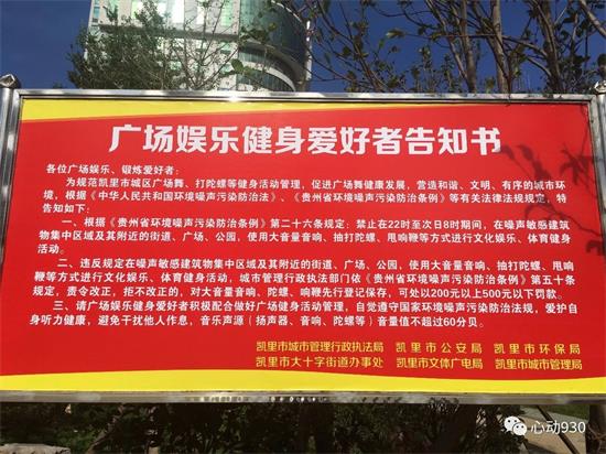 該告知書顯明確指出,根據《貴州省環境噪聲污染防治條例》第二十六條規定:禁止在22時至次日8時期間,在噪聲敏感建筑物集中區域及其附近的街道、廣場、公園,使用大音量音響、抽打陀螺、甩響鞭等方式進行文化娛樂、體育健身活動。