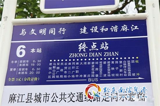 為了有效解決麻江縣城和凱里市碧波鎮兩地城鄉居民出行難問題,加強麻江縣和凱里市爐碧經濟工業園區交流協作,促進地方經濟互聯互通,讓百姓得到實惠,凱里公交總公司麻江公司在麻江至枧沖設立了6路公交線路,主要途經馬鞍山公園、雙擁廣場、麻江二小、麻江職中、碧波便民服務中心、凱里西站物流園等站點,里程14.5公里,途經23個站。