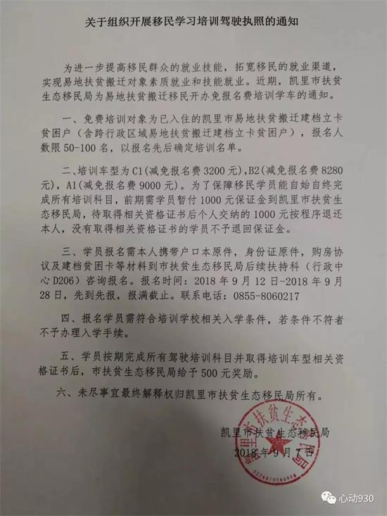 學(xué)員報(bào)名需本人攜帶戶口本原件,身份證原件,購(gòu)房協(xié)議及建檔貧困卡等材料到市扶貧生態(tài)移民局后續(xù)扶持科(行政中心D206)咨詢報(bào)名。報(bào)名時(shí)間:2018年9月12日-2018年9月28日,先到先報(bào),報(bào)滿截止。聯(lián)系電話:0855-8060217。