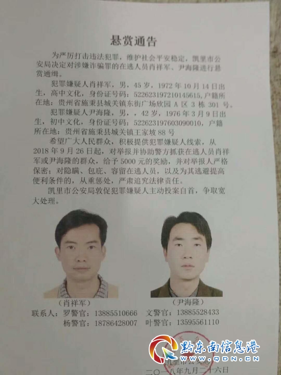 同時凱里市公安局表示:若有發現犯罪嫌疑人者可撥打聯系電話聯系凱里市公安局民警,聯系方式為:羅警官13885510666、 文警官13885528433、 楊警官18786428007、 葉警官13595561110。