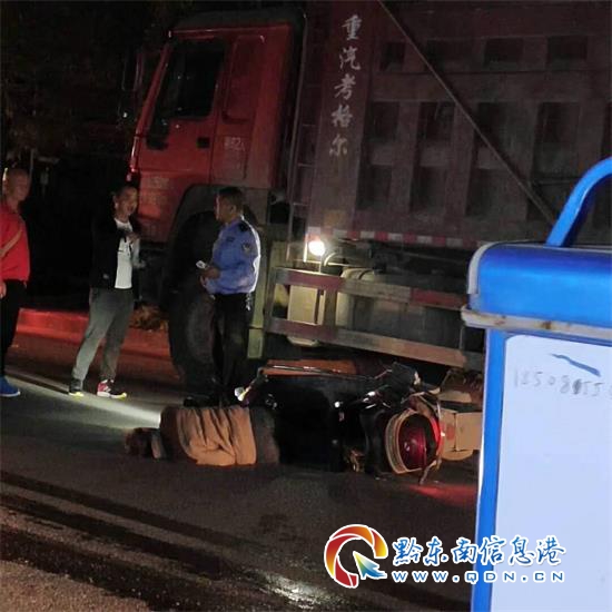 當晚八點半左右,一輛大貨車停在三棵樹集鎮的公路邊,之后駕駛員外出購物。期間,一輛摩托車(電動車)突然從他處駛來,緊接著載倒在了大貨車票后輪之間,駕駛員摔倒在地。