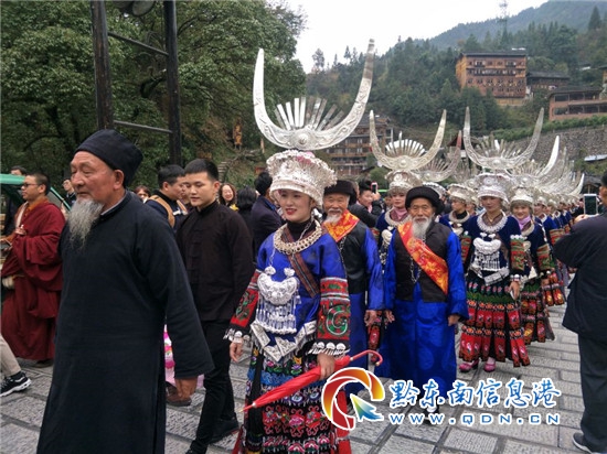 11月19日下午,一對(duì)苗族“新人”在接親隊(duì)伍的陪伴下,抬著糯米飯、豬罷腿、紅雞蛋、稻花魚、糖果以及香甜米酒歡歡喜喜地前往新郎家。一路上蘆笙飄揚(yáng),歡笑聲此起彼伏,接親隊(duì)伍不時(shí)向游客拋喜糖、敬牛角喜酒,現(xiàn)場(chǎng)喜氣洋洋,熱鬧非凡。一瞬間,西江千戶苗寨景區(qū)變成了歌的世界,舞的海洋。