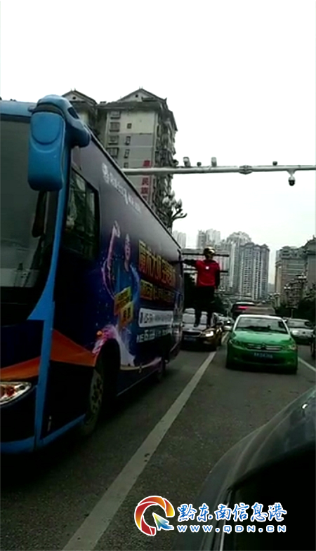 本網訊 (記者 姜芳)11月24日上午,多段“男子懸浮巴士”視頻在凱里朋友圈廣泛傳播,一輛行駛的大巴車側后方,竟然懸掛著一個頭戴面具的男子,只見該男子“單手懸浮”巴士,另一只手則向路邊眾人招手,市民們看后除了感到新奇,還擔心道:這會不會有危險!