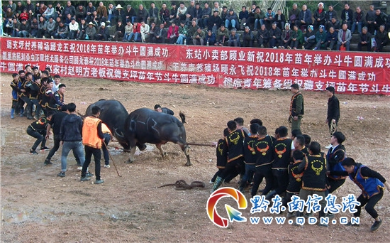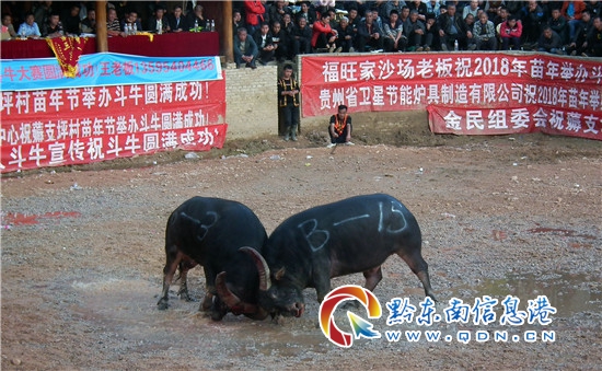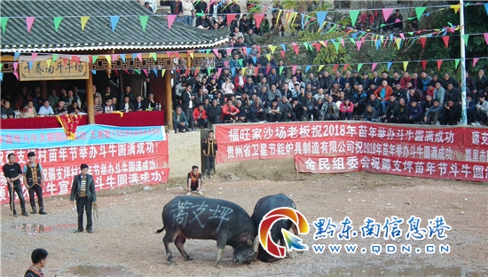 中國凱里苗年節牛王爭霸賽于11月25日至10月27日在凱里市三棵樹斗牛場舉行,共有50多頭牛王參加角逐,經過三天的比賽決出一、二、三名。節日期間,還舉行了蘆笙、五彩繽紛苗族服飾、苗族歌舞、斗雞、銀飾、刺繡等活動,激烈的比賽場面吸引了5萬多游客觀眾到場觀看,觀眾席上不斷傳來陣陣掌聲和歡呼聲,場面趣味無窮。(姜澤鵬)