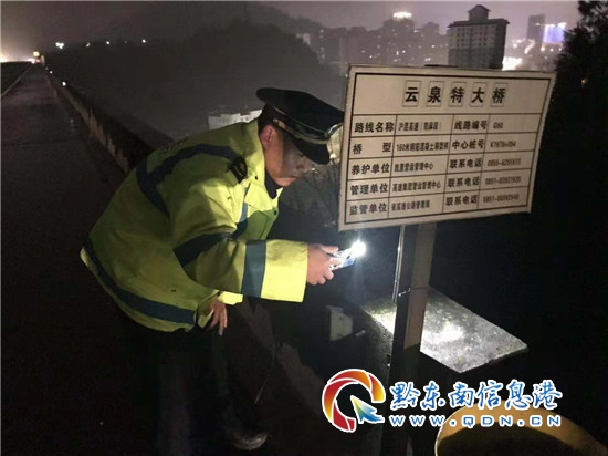 易凝凍路段主要有高架橋、立交橋、坡面路段及地勢高路段,易凝凍時間主要分布在深夜至次日清晨時段,針對以上特點凱里路政執法大隊路政員深夜迎著小雨披上雨衣化身小黃人,對轄區內云泉特大橋、青虎沖大橋、夾巖河大橋、K1701+000—K1710+000長下坡等路段進行巡查,必要時將對路面進行預防性撒鹽除冰工作,確保司乘人員行車安全。