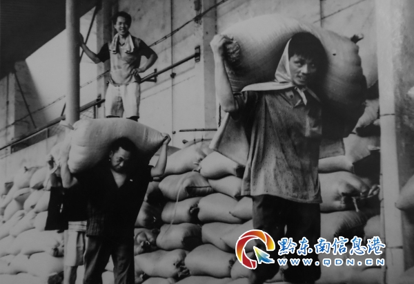 改革開放初期,凱里縣運(yùn)輸裝卸公司員工搬運(yùn)貨物。(范寅平 攝 楊仁海 翻拍)