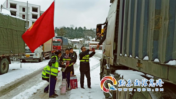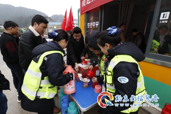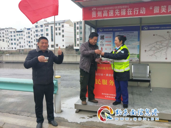 中午時分,大部分車上的乘客們都顯得十分疲憊,凝望著窗外白色的莽山,不知道還要多久才能再次出發(fā),只能佝僂著饑腸轆轆的肚子和渾渾噩噩的腦袋在車上等待,此時一群美麗的姑娘們身著制服端著一杯杯溫暖的姜茶悄然來到了車前,“先生您好,冬日寒冷,喝一杯姜茶暖暖身子吧,我們的高速先鋒和一路三方正在道路上抗凝保通,等冰雪清除了,您就可以出發(fā)了,還請稍等片刻”,然后手指向收費站旁的一個小屋子:“那里是我們的便民服務亭,亭內(nèi)可以免費為您提供一些應急的物資食物和開水,還有充電器、針線包…,”這一道道倩影不停地在車流間穿梭,述說著、奉獻著,她們就是貴州高速集團凱里營運管理中心的“微笑阿蕾”們。 漸漸地,收費站的便民服務亭變得熱鬧了起來,聊天聲、兒啼聲、沸水聲,乘客們在便民服務亭內(nèi)躲避風雪,“微笑阿蕾”們暖心地提供著便民服務,讓這個冬季溫馨四溢。