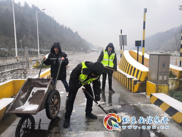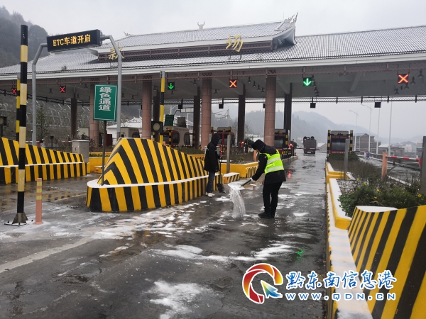 款場站在疏散了第一批滯留車輛后并沒有放下工作腳步,而是第一時間對收費區(qū)域車道的結(jié)冰情況進(jìn)行了隱患排查。雖然天氣格外寒冷,細(xì)小的米雪還會不時的打到臉上,但這些都不能阻擋貴州高速先鋒工作者的高漲熱情和敬業(yè)精神,因為大家都很清楚,封閉解除后會陸續(xù)有車輛下站,時間就是生命,只有爭分奪秒迅速清除凝凍的冰雪,才能給過往司乘提供安全的行車環(huán)境。