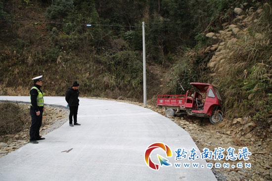 2月4日,在黎平縣肇興鎮通村公路上發生一起事故,一輛正三輪摩托車撞到了路邊山體上。黎平縣公安局交通警察大隊七中隊民警接到報警后,迅速前往現場處理。