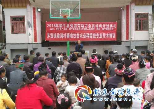 本網訊 3月4日,由黎平縣人社局、黎平縣農業局、茅貢鎮人民政府主辦,黎平振華電校承辦的“黎平縣貧困勞動力全員培訓開班典禮暨茅貢鎮蠶洞村精準扶貧種養殖技術培訓” 在黎平縣茅貢鎮蠶洞村的操場上隆重舉行,參加次培訓的共有一百余人。