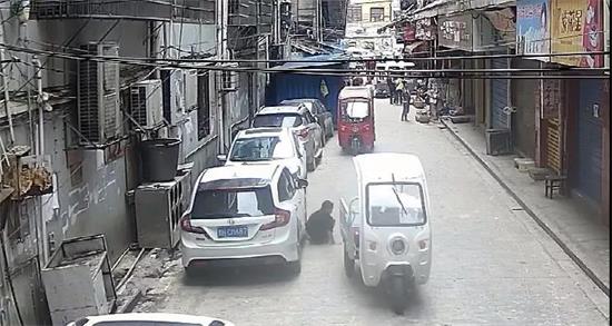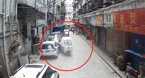 而該名駕駛員則被擠壓在突然撞來的三輪車與小轎車之間,倒在地上,差點(diǎn)被卷入三輪車車底,萬幸的是三輪車車頭碰撞到小車后因受力改變方向,才沒有造成更嚴(yán)重的后果。