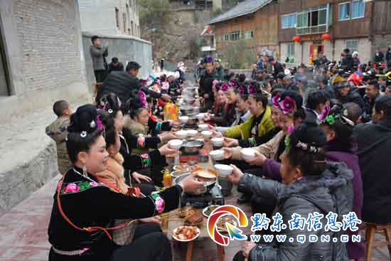 由于歷史的原因,現有17戶在他鄉安居落戶(其中,有在劍河展剛4戶,福泉4戶,凱里季刀4戶,臺江南宮3戶,雷山烏東1戶,凱里排樂1戶)。聚會是為了讓后代子孫代代相認親兄姊妹,增強家族凝聚力。由在黃里小寨49戶侯氏兄弟的組織下,于戊戌年“春節”的初二“庚辰”日所有侯氏宋講家族住在他鄉的男女老少乘坐大小車輛趕到“老家”。大年初三當天上午,外嫁他鄉的100余名姑媽們匯集在黃里新村,下午12時整進發,姑爹抬著2頭大肥豬,其余的姑媽挑著糯米飯、鴨、魚、糖果和66個電飯煲等禮物,她們的年齡最大82歲,最小23歲,浩浩蕩蕩回娘家,與娘家人歡聚一堂。舅家殺豬殺牛盛情款待,并回贈每位姑媽一只銀手鐲作紀念。(張希才 攝影報道)