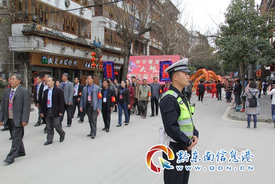 本網(wǎng)訊 3月1日, 雷山縣丹江鎮(zhèn)木鼓廣場(chǎng)舉辦春節(jié)龍燈花燈大賽。由縣城周邊村寨30多支龍燈、花燈代表隊(duì)參加了比賽,舞龍?jiān)阼尮陌樽嘞�,時(shí)跳時(shí)蹲,動(dòng)作豐富,手中的巨龍也在他們的舞動(dòng)中左右翻卷、起落騰飛,氣勢(shì)奪人,為狗年新春佳節(jié)增添了濃濃的喜氣。圖為民警為龍燈隊(duì)巡游保駕護(hù)航。(楊正道)