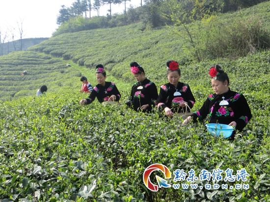 圖為丹江苗族婦女在滿天星茶場采摘茶青場景