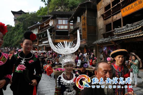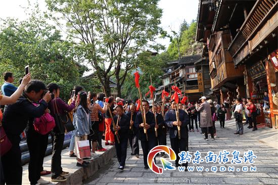 當天下午,一對苗族“新人”在接親隊伍的陪伴下,抬著糯米飯、豬罷腿、紅雞蛋、稻花魚、糖果以及香甜米酒歡歡喜喜地前往新郎家。一路上蘆笙飄揚,歡笑聲此起彼伏,接親隊伍不時向游客拋喜糖、敬牛角喜酒,現場喜氣洋洋,熱鬧非凡。