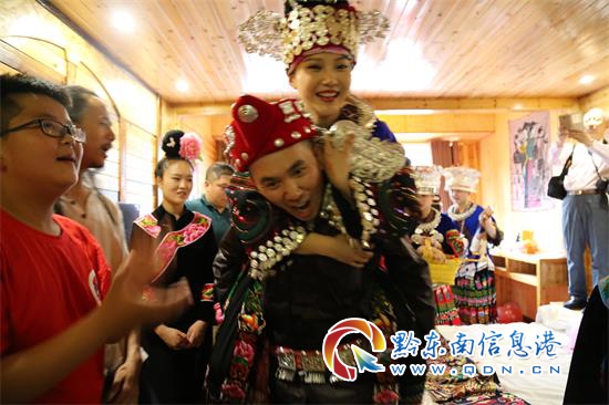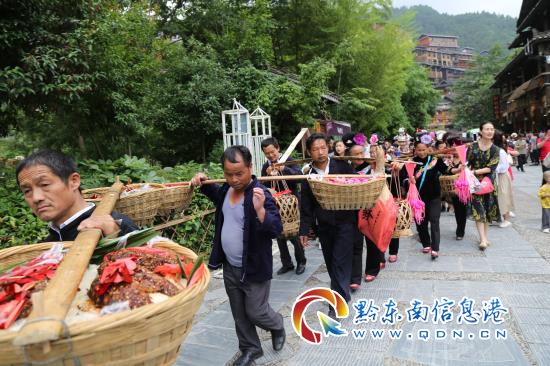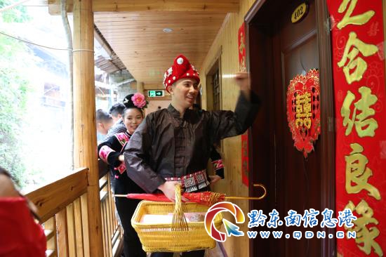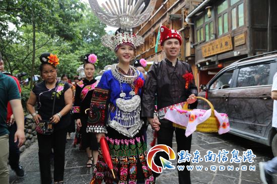 據(jù)悉,新郎官楊黔東先生(苗族人)是貴州省麻江縣人,研究生,目前在德國(guó)留學(xué);新娘朱冰貞女士是江蘇徐州人,目前在北京工作。二人以前在北京學(xué)“川劇”時(shí)認(rèn)識(shí)且相愛(ài),并決定今年5月26日結(jié)婚。因楊黔東是苗族人,所以他決定用一場(chǎng)特殊的苗族婚俗來(lái)舉辦婚禮。二人和家人商定后,決定到全國(guó)乃至世界最大的西江千戶(hù)苗寨來(lái),用一場(chǎng)特殊的苗族婚禮來(lái)見(jiàn)證他們堅(jiān)貞不渝的愛(ài)情。經(jīng)過(guò)多方聯(lián)系,得到了西江旅游公司的大力支持,幫助他們?cè)谖鹘?hù)苗寨圓了這場(chǎng)特殊并有意義的苗族婚俗夢(mèng)。(侯天智 王曉)