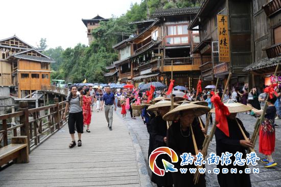 一路上,一對(duì)“新人”在迎親送親隊(duì)伍的陪同下,蘆笙飄揚(yáng),歡笑聲此起彼伏,接親隊(duì)伍不時(shí)向游客拋喜糖、敬牛角喜酒,吸引眾多游客駐足圍觀送祝福,并紛紛拿著手機(jī)和相機(jī)“咔擦”“咔擦”爭(zhēng)相拍照。現(xiàn)場(chǎng)喜氣洋洋,熱鬧非凡。