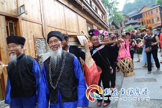圖為苗寨兩位德高望重的寨老出行見(jiàn)證這一場(chǎng)特殊的婚禮