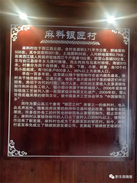 麻料銀飾品加工已有600年的歷史,苗家人代代相傳,把日月星辰、花鳥蟲魚、飛禽走獸鍛造融入銀飾中,栩栩如生,在省內外頗有盛名。2006年,苗族銀飾鍛造技藝被列入第一批國家級非物質文化遺產;2009年初,麻料村被評為“中國銀飾之鄉”。