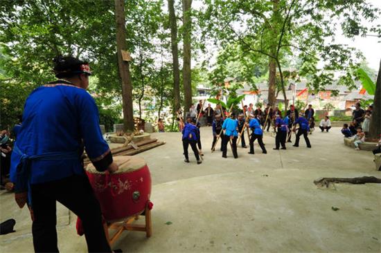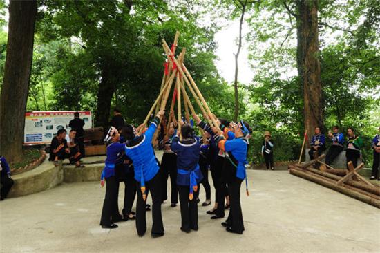 ↑畬族婦女跳起粑槽舞迎接遠方的客人。(姚寧 李軼 王成軍 攝)
