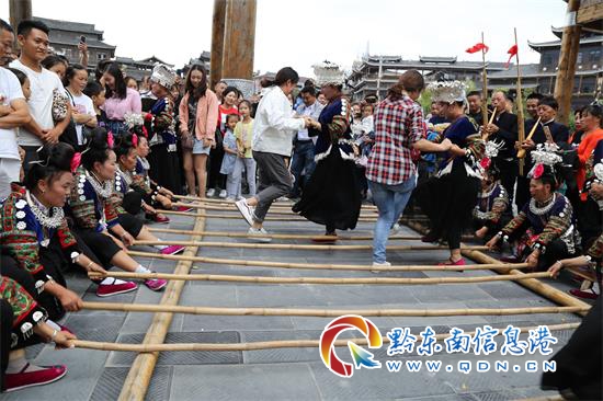 游客在西江體驗”苗族蘆笙竹竿舞“