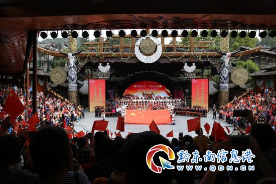 為了慶祝偉大祖國69周歲的華誕日,國慶第一天,景區特意在北大門、景區表演場、西門迎賓廣場等地舉起了鮮艷的五星紅旗,吸引了眾多游客們前來合影留念。五星紅旗讓游客們感受到濃烈的節日氣氛和愛國情懷,也使得西江千戶苗寨景區呈現出另一番精彩。