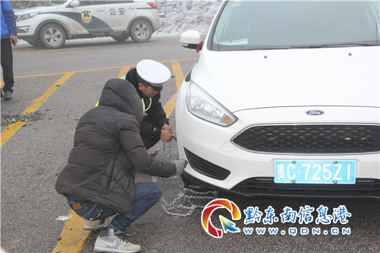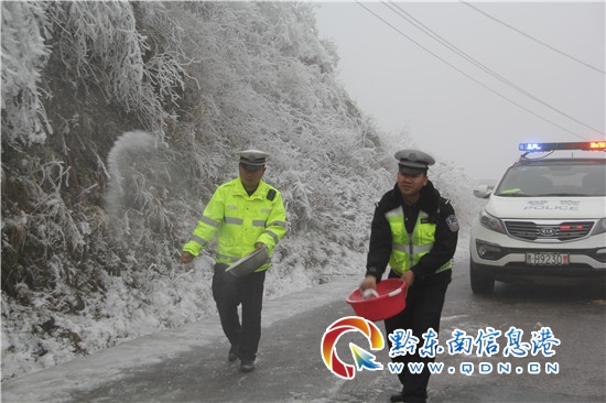 雷山縣公安局交警大隊立即啟動惡劣天氣應急處置預案,全警動員、抗凝凍、斗嚴寒,在冰雪道路上撒鹽除冰保平安,為群眾冰雪凝凍出行保駕護航。(楊正道)