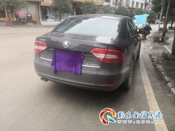 12月26日,雷山縣城正值趕集,車流量逐漸增大,上午10時左右,該大隊民警巡邏至雷公山大道新點私人定制洗發店路段,發現停在路邊的一輛灰色轎車牌照被遮擋,遂加速上前查看,原來轎車后牌照上掛著紫色毛巾,被遮擋的嚴嚴實實。