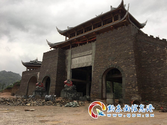 據介紹,南城門位于凱里濱江大道原玻璃廠附近路段,是香爐山景區的主要入口,其總建筑面積為3291.26平方米,由左右城墻、哨樓、拱門等組成,建筑完全仿古,古香古色,頗具特色。