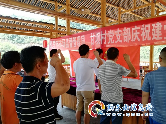 在現場活動中,全體起來,奏唱國歌,其次在甘壩村委書記劉州盛同志帶領下,全體黨員在面對黨旗,并舉起右手重溫入黨誓詞,使全體黨員進一步堅定理想信念,不忘初心,牢記使命。宣誓完畢后,凱里市場監督管理局機關黨委書記徐國雄為全體黨員上了一堂題為《不忘初心、牢記使命》的黨課,從“如何做一名模范的農村黨員,帶領群眾建設社會主義新農村”進行了講解,徐書記的講課結合實際,深入淺出,使在場的每一名黨員受到了鼓舞。隨后,徐書記向大家通報了對該村的扶貧工作情況,希望大家齊心協力、共同努力,堅定信心打勝“脫貧攻堅”這場硬仗。最后由甘壩村委書記劉州盛同志為大家解讀了黨章程,如何為甘壩村謀發展制定了一系列的目標。