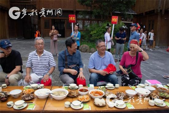 晚餐時間,大部隊回到了肇興侗寨,在這里,大家一起品嘗了長桌宴。吃飯時,身著民族服飾的侗家姑娘唱著侗家的敬酒歌,端著侗家的米酒,不時來到客人身邊敬酒,氣氛好不歡快。