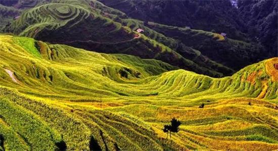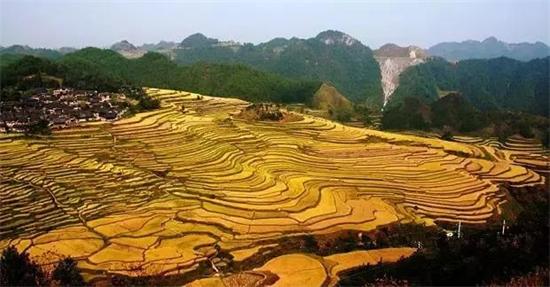 貴州那大片大片成熟或即將成熟的稻田。高要梯田群位于丹寨縣高要村西南面321國道旁,面積千余畝,地勢由高到低呈明顯梯帶形狀,該梯田景色隨季節變化而變化,不同季節有著不同的感覺色彩,用大地藝術形式創造出全國獨樹一幟的“高要多彩梯田”。